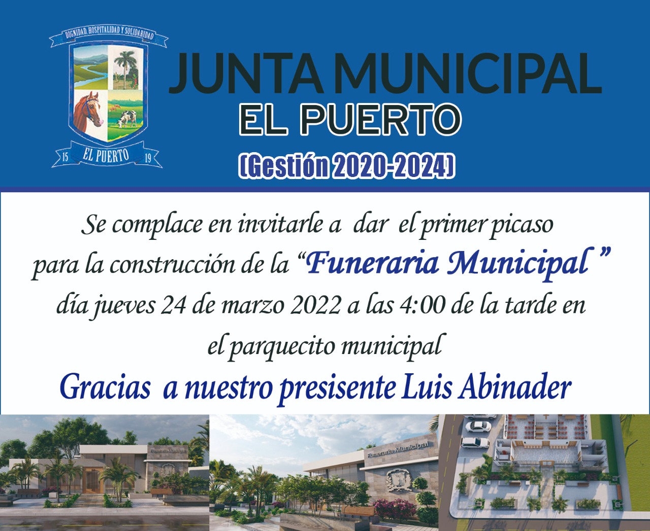 Juan Pacheco Mejía junto a su equipo de trabajo, lideres y autoridades efectúan el primer picazo para la construcción de la Funeraria Municipal que será una de las muchas obras que serán esenciales para el Distrito Municipal El Puerto y zonas aledañas.